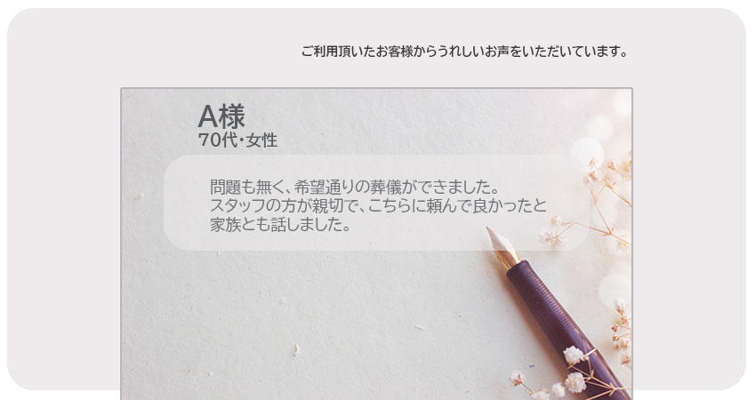 Q 提示されているプラン以外で必要な費用はありますか? 全てのプランで、ご遺体の搬送からご葬儀を終えるのに最低限必要なサービスを備えております。 例えば、市内の方の火葬料、返礼品などをご用意する場合はプラン外の費用になります。詳しくは各プランの詳細ページをご覧ください。